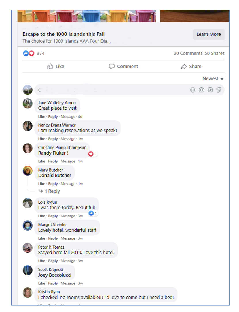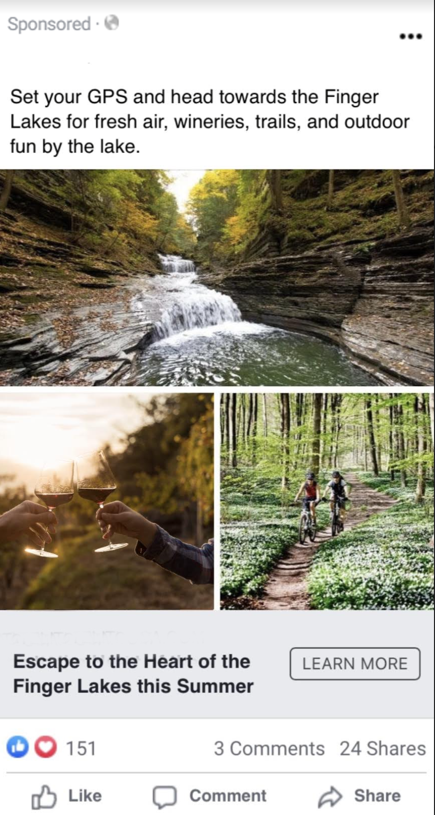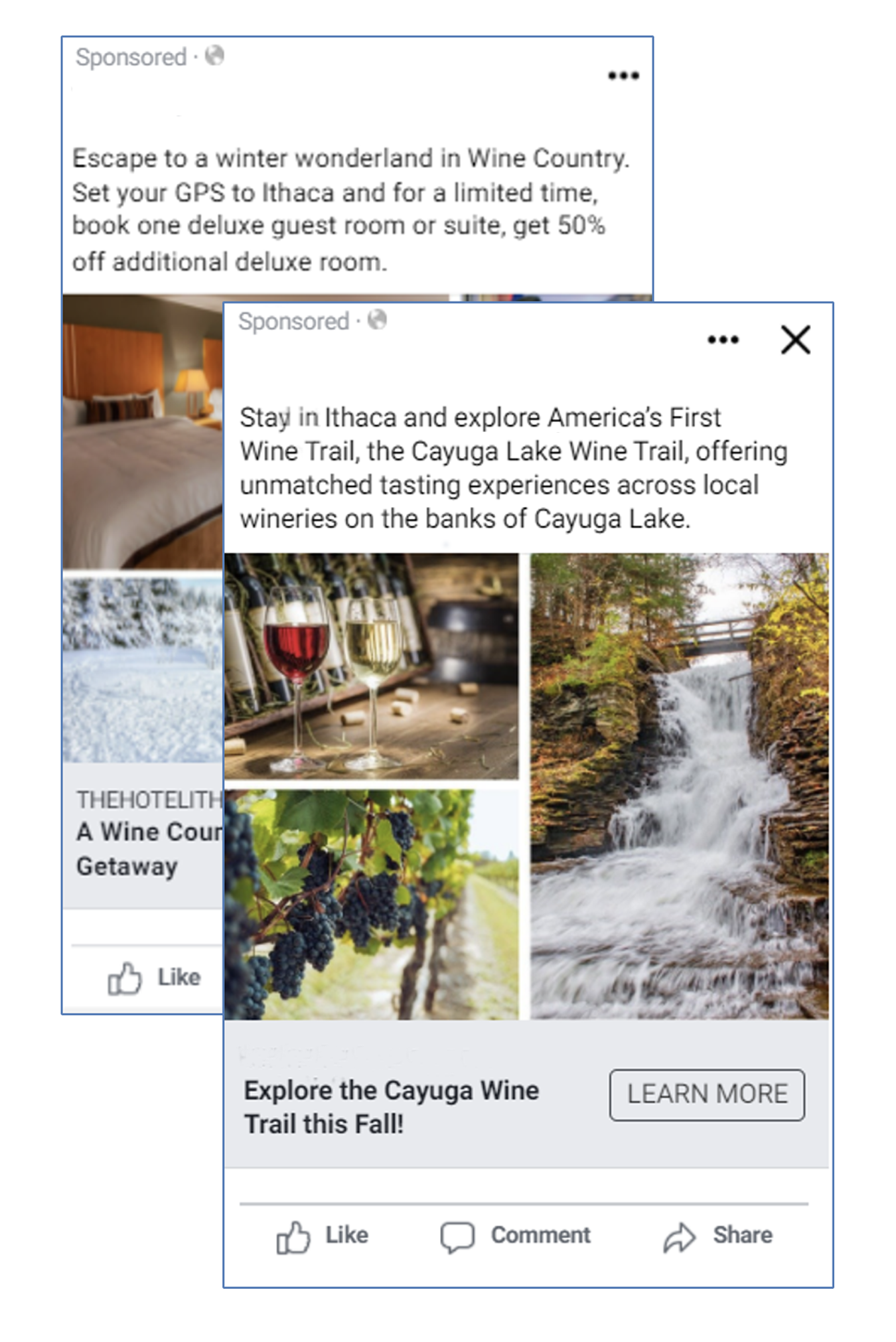 - The prospecting phase of the cycle delivered ads to users on Facebook and Instagram whose interests and behaviors matched the destinations we were marketing. This included wine lovers, hikers & bikers, sport fishing regulars, lake loungers, history buffs, and other categories that could be translated into consumer behavior and online engagement via Facebook’s targeting parameters. By showcasing experiences that resonated with each target segment sought to capture the attention (and clicks!) of our intended targets.